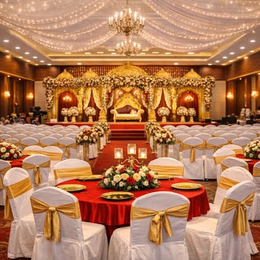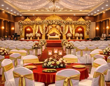 We provide elegant stage décor and mandap setup options, well-planned lighting arrangements, and a quality sound system to enhance the overall wedding experience. Our venue also offers essential facilities such as power backup, clean washrooms, changing rooms, and ample parking, ensuring comfort and convenience for all your guests. With experienced on-ground support and coordinated services, we ensure that your wedding functions run seamlessly from start to finish.